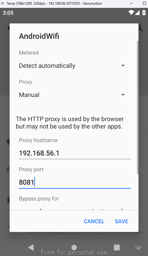 At the top of the emulator screen, you’ll see the device’s IP address. You need this IP for configuring the Burp Suite proxy. In my case, it is 192.168.56.107.