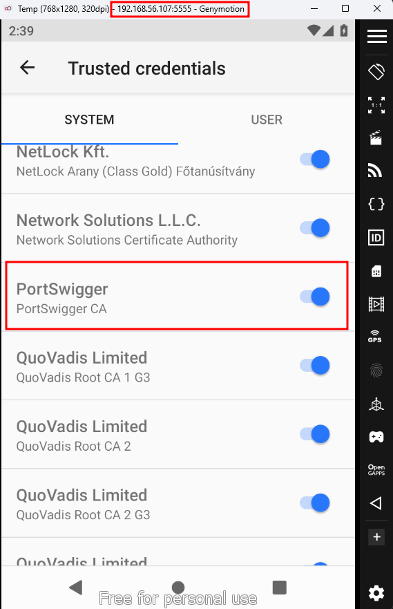 After rebooting, go to Settings > Trusted Credentials and check that the Burp Suite certificate is now listed under System-level certificates.