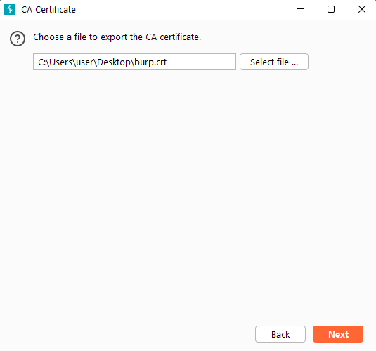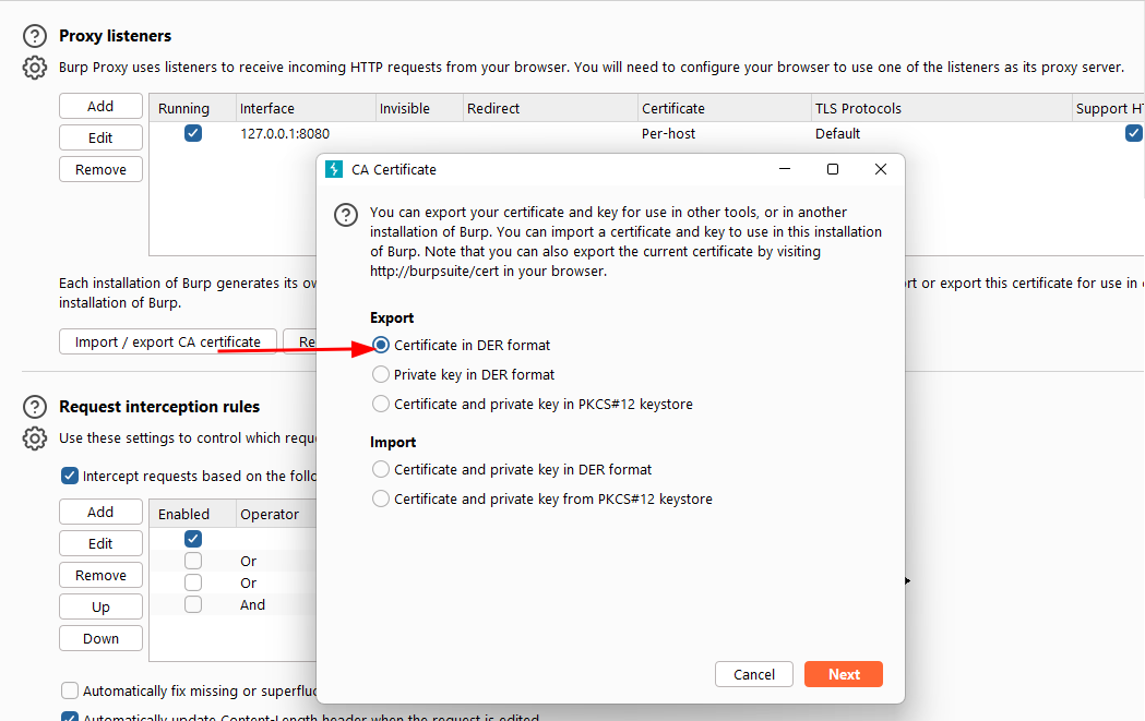 First, obtain the Burp Suite certificate. Open Burp Suite, go to the Proxy tab, then Proxy Settings. Click Import / Export CA Certificate, export it in DER format, and save it with a .crt extension (e.g., burp.crt).