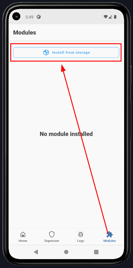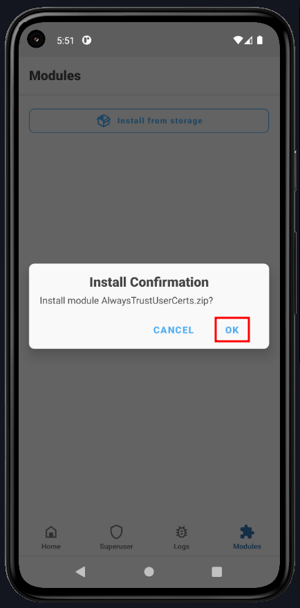 To move the certificate to the system, install AlwaysTrustUserCerts.zip. Open Magisk, go to Modules, and click Install from Storage.