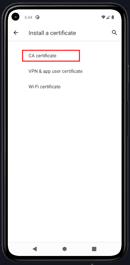 Go to Settings on your device and search for Install a Certificate. Select CA Certificate, and when prompted, click Install Anyway. The certificate will be in the Downloads folder. Tap it to install.