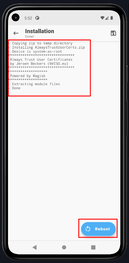After rebooting, open Magisk and check the Modules section. You should see Always Trust User Certificates installed.