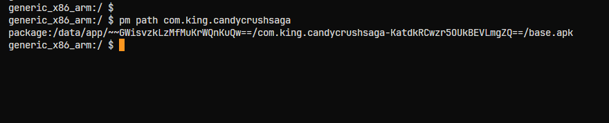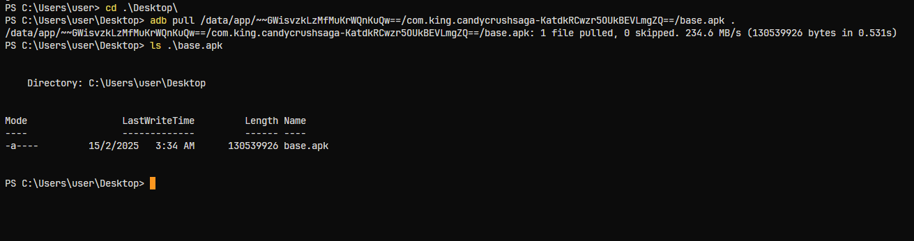 Using the full path name, pull the APK file from the Android device to the machine.