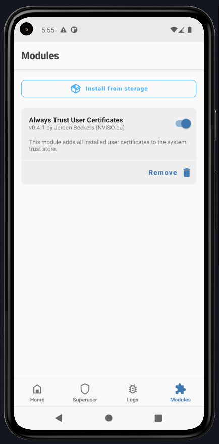 To move the certificate to the system, install AlwaysTrustUserCerts.zip. Open Magisk, go to Modules, and click Install from Storage.
